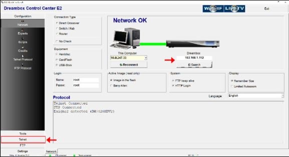 Commencez par télécharger DCC_E2 (Dreambox Control Center pour Enigma2). Vous devez vous connecter à votre box Enigma via Dreambox Control Center E2 et cliquer sur “Telnet”. Mais avant cela, il est essentiel de connaître l’adresse IP de votre box Enigma2. Nous verrons cela dans l’étape suivante.